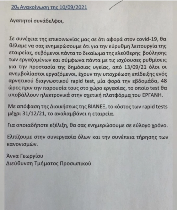 Συγκεκριμένα, ο ιδιοκτήτης της ΚΑΕ Παναθηναϊκός, Πρόεδρος Δ.Σ. και Διευθύνων Σύμβουλος της ΒΙΑΝΕΞ Α.Ε με αναρτήσεις του στον προσωπικό του λογαριασμό στο Instagram γνωστοποίησε ότι η ΒΙΑΝΕΞ θα αναλάβει το κόστος για τα τεστ που υποχρεούνται να κάνουν οι ανεμβολίαστοι εργαζόμενοί της.