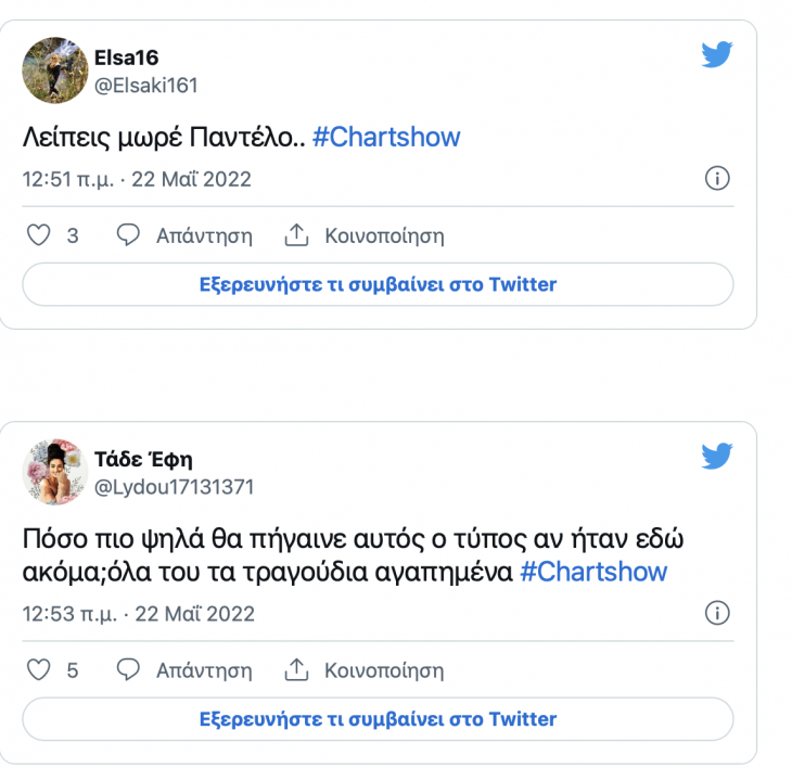 Με αφορμή το Chart Show και το επεισόδιο με τους 30 πιο επιτυχημένους άνδρες καλλιτέχνες, ο Παντελής Παντελίδης ήρθε ξανά στις μνήμες όλων. Ο τραγουδιστής που κέρδισε αμέσως το ευρύ ελληνικό κοινό, γράφοντας και μελοποιώντας τραγούδια και μοιράζοντάς τα στο YouTube, κατέκτησε την πέμπτη θέση στο μουσικό σόου με τη Δέσποινα Βανδή.