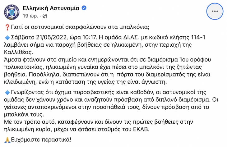 «Γιατί οι αστυνομικοί σκαρφαλώνουν στα μπαλκόνια; Σάββατο 21/05/2022, ώρα 10:17. Η ομάδα ΔΙ.ΑΣ. με κωδικό κλήσης 114-1 λαμβάνει σήμα για παροχή βοήθειας σε ηλικιωμένη, στην περιοχή της Καλλιθέας. Άμεσα φτάνουν στο σημείο και ενημερώνονται ότι σε διαμέρισμα 1ου ορόφου πολυκατοικίας, ηλικιωμένη γυναίκα έχει πέσει στο μπαλκόνι της ζητώντας βοήθεια.