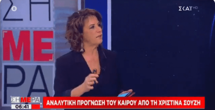 Εκνευρισμένη εμφανίστηκε σήμερα στην εκπομπή του ΣΚΑΪ η Χριστίνα Σούζη, μετά τις χθεσινές δηλώσεις του Κυριάκου Μητσοτάκη στη Βουλή για την κακοκαιρία Ελπίδα και τις προβλέψεις των μετεωρολόγων.