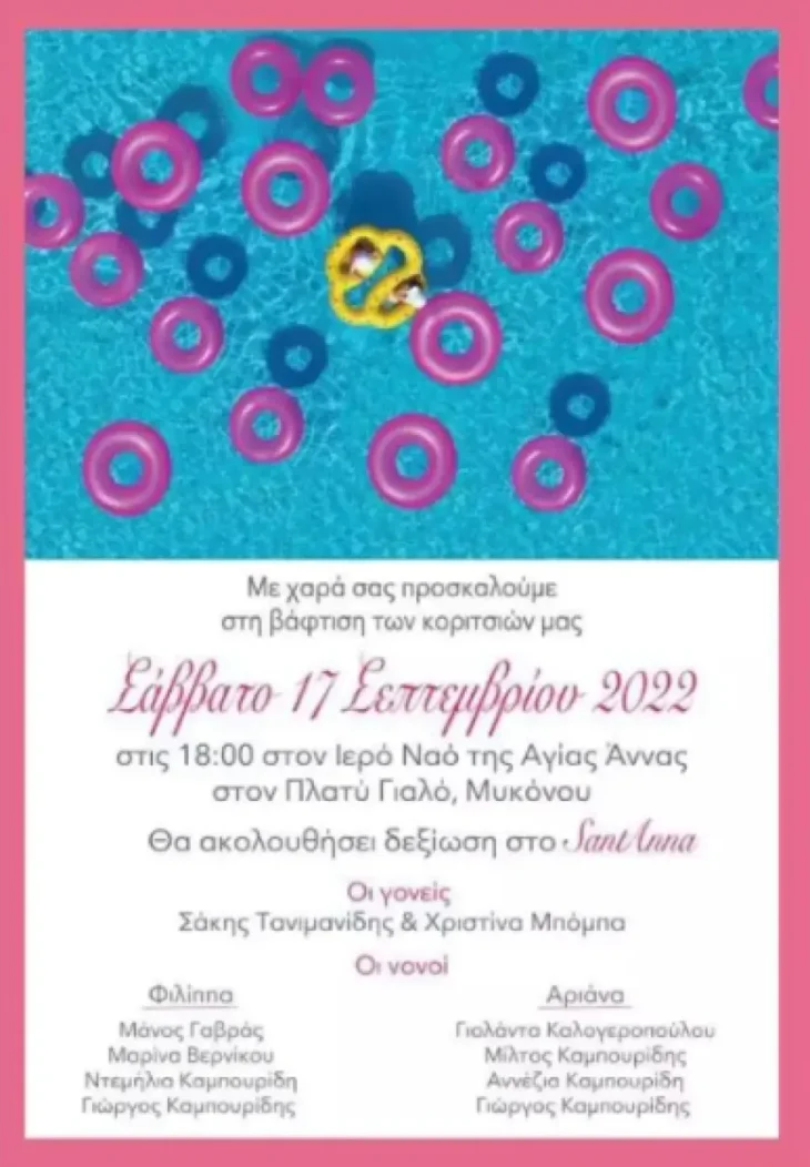 Μια τεράστια βάφτιση έχουν οργανώσει το ζευγάρι Μπόμπα – Τανιμανίδης για τις μικρές τους κόρες, οι οποίες θα βαφτιστούν σήμερα στο νησί των ανέμων.