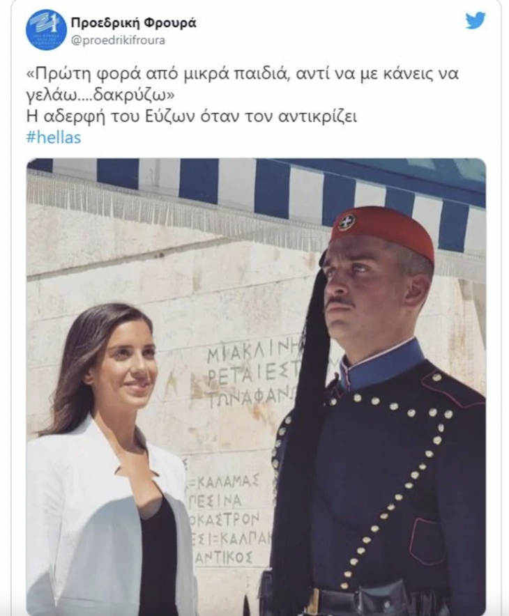 «Πρώτη φορά από μικρά παιδιά, αντί να με κάνεις να γελάω….δακρύζω», τιτλοφορείται η ανάρτηση στην οποία έχει παρατεθεί η φωτογραφία ενός Εύζωνα τον οποίο κοιτάει η αδερφή του γεμάτη υπερηφάνεια, ενώ φιλάει σκοπιά στο μνημείο του Άγνωστου Στρατιώτη στο Σύνταγμα.