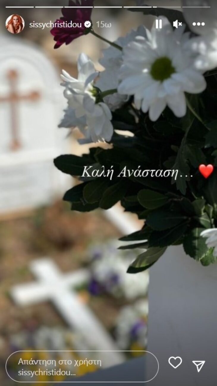 Η Σίσσυ Χρηστίδου δεν ξεχνά ποτέ τη μητέρα της και έτσι, λίγες ώρες πριν την Ανάσταση του Κυρίου, θέλησε να επισκεφθεί το μνήμα της, δημοσιεύοντας μάλιστα και μια σχετική φωτογραφία στον λογαριασμό της στο Instagram και γράφοντας «καλή Ανάσταση».
