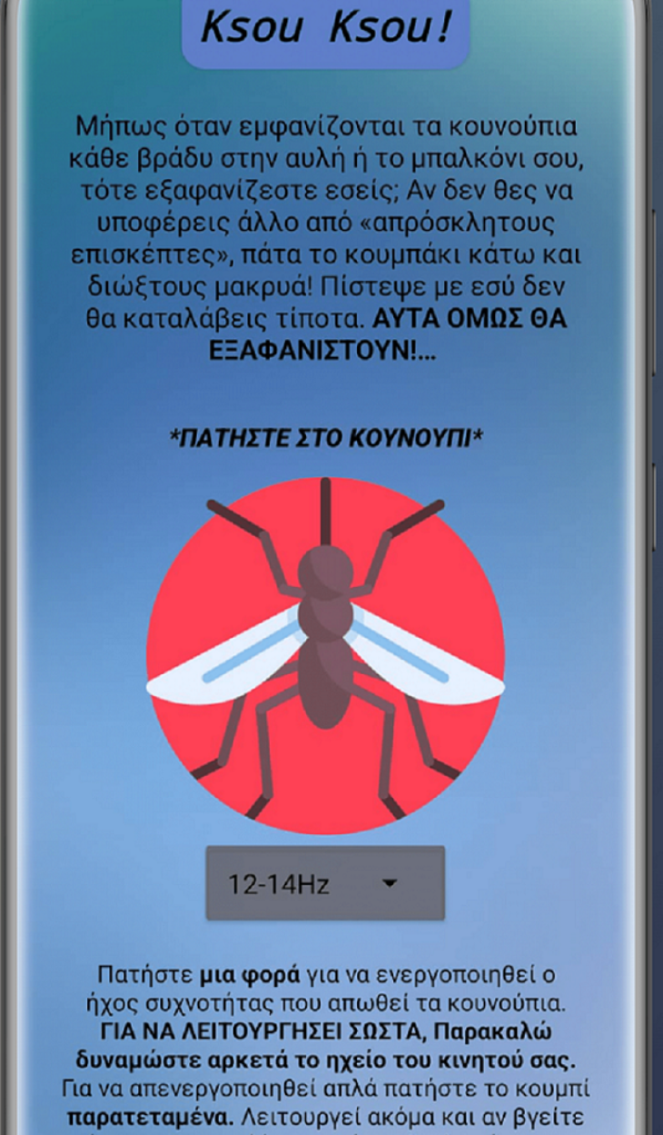 «Με την εφαρμογή δημιουργείται μια τοπική ασπίδα 3Χ3 που προστατεύει από τα κουνούπια» τόνισε. Όπως εξήγησε ο Λαρισαίος προγραμματιστής, το app, με το όνομα «Ksou – Ksou», βασίζεται σε πρόσφατες πενταετείς έρευνες, και απωθεί τα κουνούπια μέσω συχνοτήτων που μπορεί να κυμαίνονται από τα 12 έως και τα 200HZ.
