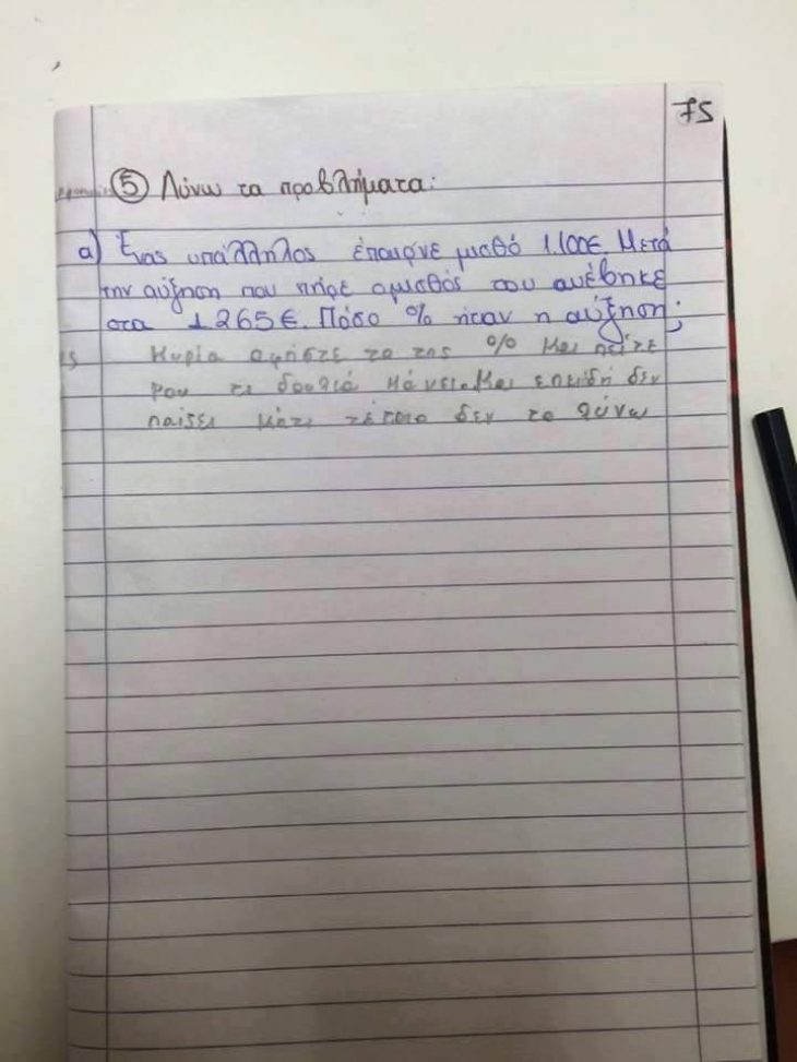 Σε ένα μαθηματικό πρόβλημα ένας μαθητής κατάφερε να δώσει μία αληθινά μυθική απάντηση. Πιο συγκεκριμένα, το μαθηματικό πρόβλημα ρωτάει τον μαθητή να βρει το ποσοστό της αύξησης που έλαβε ένας υπάλληλος που λαμβάνει νέο μισθό 1265 ευρώ, ενώ πριν ο μισθός του ήταν 1100 ευρώ.