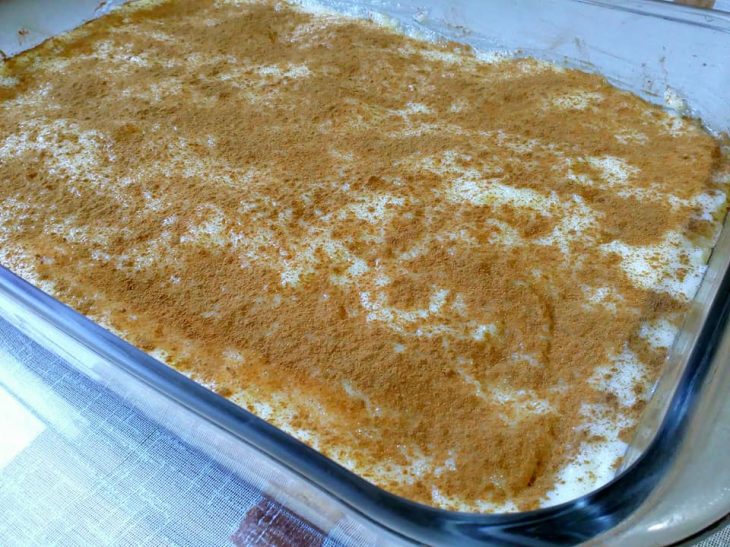 Όταν έχει κρυώσει τελείως το γλυκό μας απλώνουμε την κρέμα ομοιόμορφα πασπαλίζοντας με μπόλικη κανέλα.