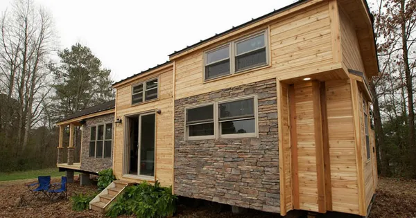 Πρόκειται για μια κατασκευή του Tiny House Nation και όπως μπορείτε να δείτε, εύκολα κάποιος ερωτεύεται το κλασσικό εξωτερικό του που συνδυάζει άψογα το ανοιχτόχρωμο ξύλο με την πέτρα.