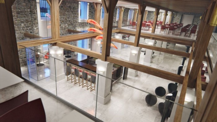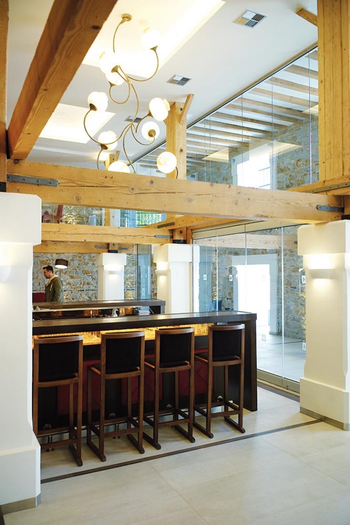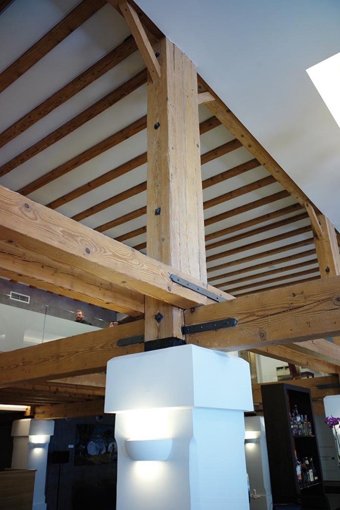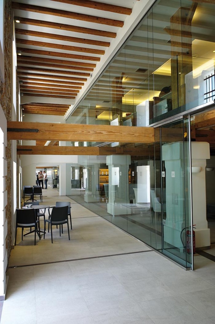 Εσωτερικά όλος ο ξύλινος φέρων οργανισμός, καθώς και τα πατώματα παρέμειναν ως είχαν, αφού συντηρήθηκαν και περάστηκαν στην τελική φάση με κατάλληλο βερνίκι μάζας για πυροπροστασία, χωρίς να επηρεαστεί καθόλου το χρώμα των ξύλων.