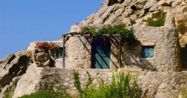 Ένα παραδοσιακό πέτρινο σπίτι, χτισμένο στις βραχώδεις πλαγιές της Μυκόνου. Από μακρυά δύσκολα το ξεχωρίζεις.