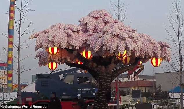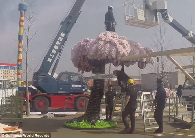 Με ύψος σχεδόν 4,3 μέτρα και πλάτος 1,5 μέτρων αυτή η βάρους 3,3 τόνων κατασκευή καταχωρήθηκε στο Βιβλίο Ρεκόρ Γκίνες ως «η μεγαλύτερη ανθισμένη κερασιά από τουβλάκια LEGO, αναφέρει το Αθηναϊκό Πρακτορείο Ειδήσεων. Σχεδιάστηκε στην Τσεχία και μεταφέρθηκε στην Ιαπωνία, όπου χρειάστηκαν περισσότερες από 6.500 ώρες για να συναρμολογήσουν τα 881.470 τουβλάκια.