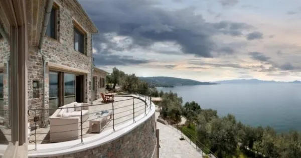 Η εντυπωσιακή κατοικία βρίσκεται στο Πήλιο, σε μια πλαγιά με ελαιώνες που καταλήγει σε βραχώδη παραλία.