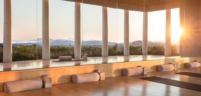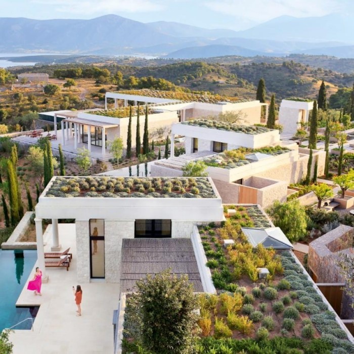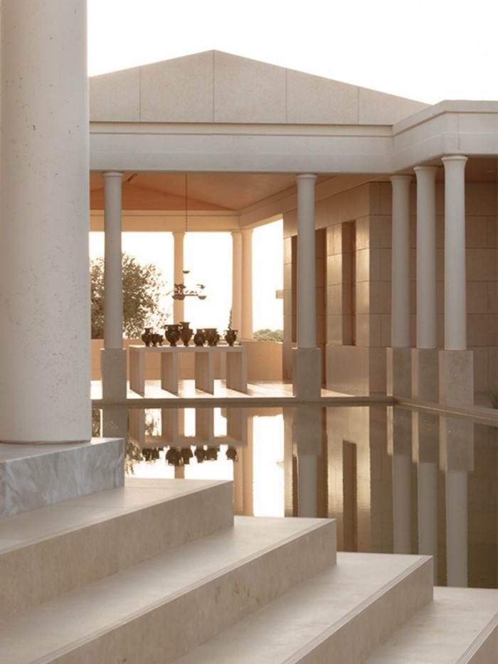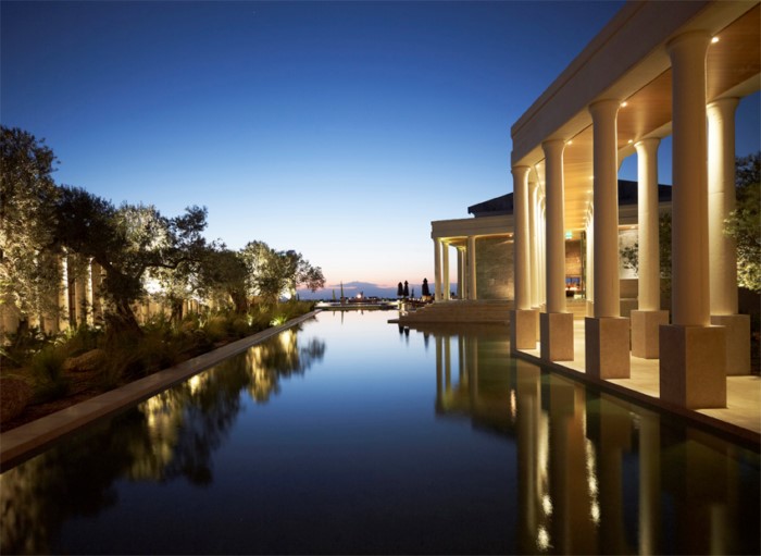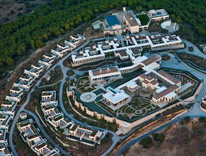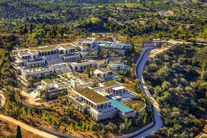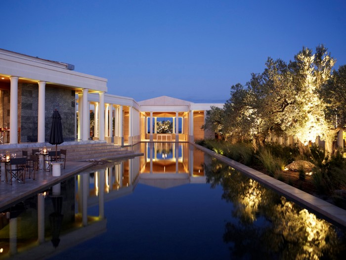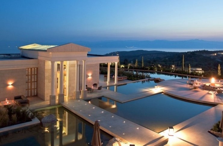 Ονομάζεται Amanzoe (από την σανσκριτική λέξη “aman” που σημαίνει “ειρηνικό” και την ελληνική λέξη “ζωή”) και θυμίζει αρχαιοελληνικό ανάκτορο.