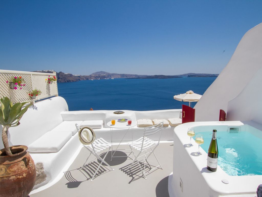 Στην ιδιωτική βεράντα υπάρχει χώρος για χαλάρωση, φαγητό ή ακόμα και ηλιοθεραπεία, με φόντο την πιο εκπληκτική θέα της Σαντορίνης: το ηφαίστειο, το βράχο της καλντέρας και το νησί της Θηρασιάς.