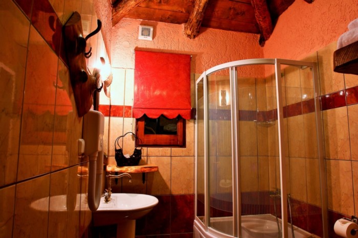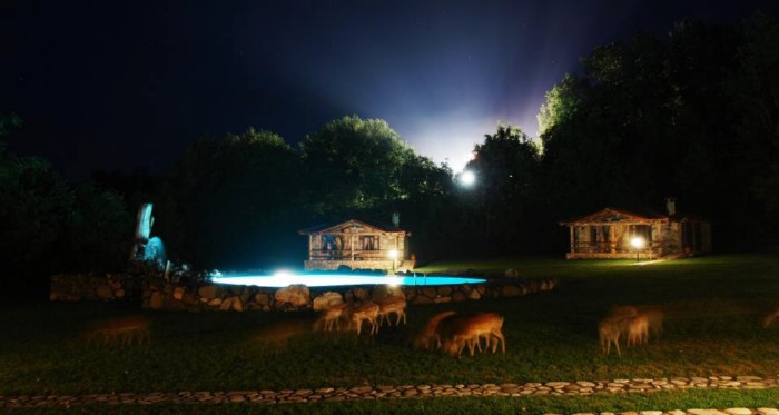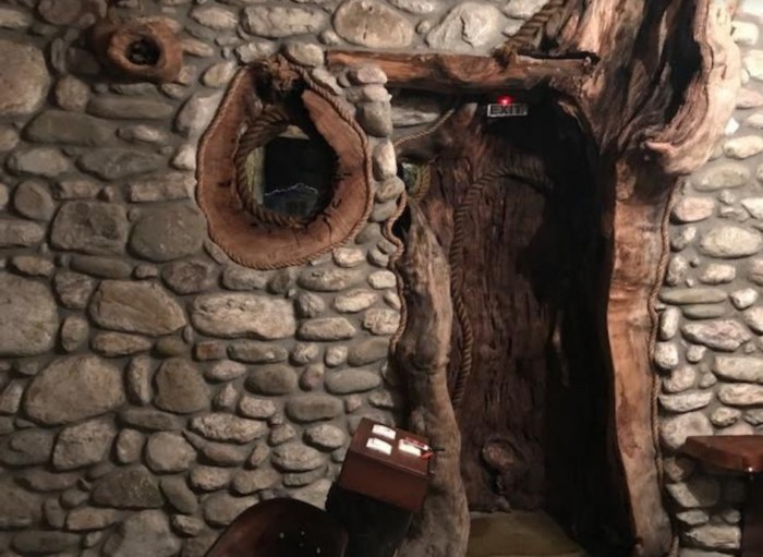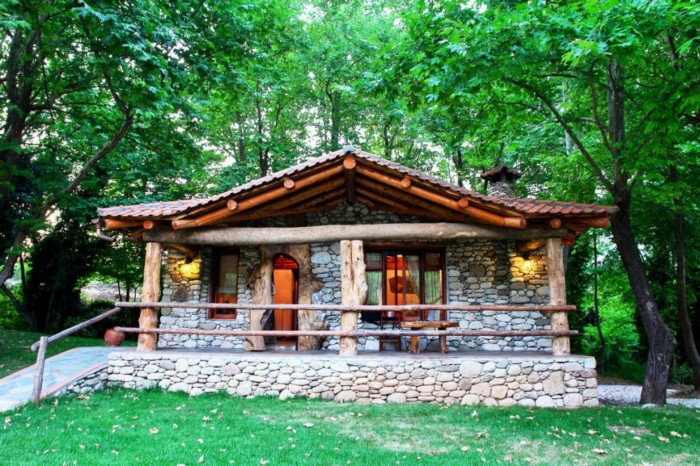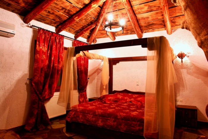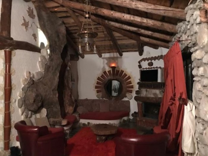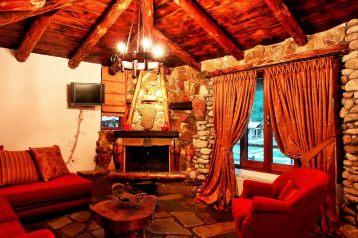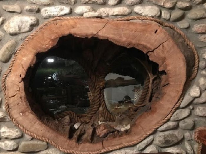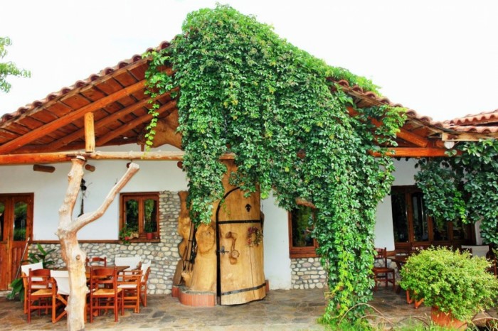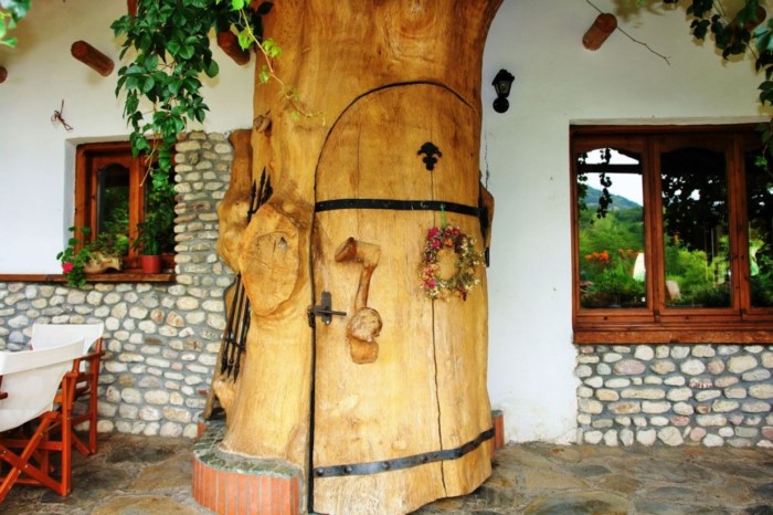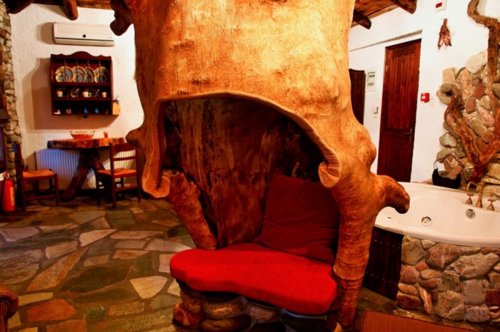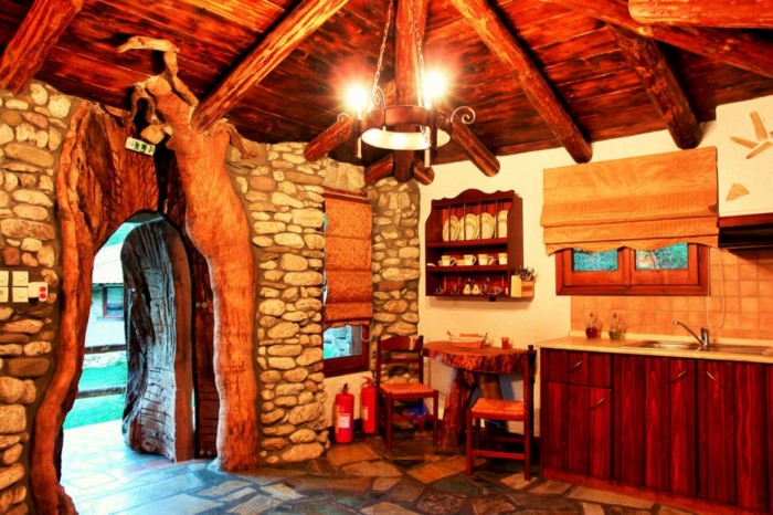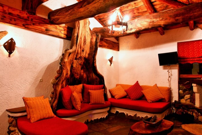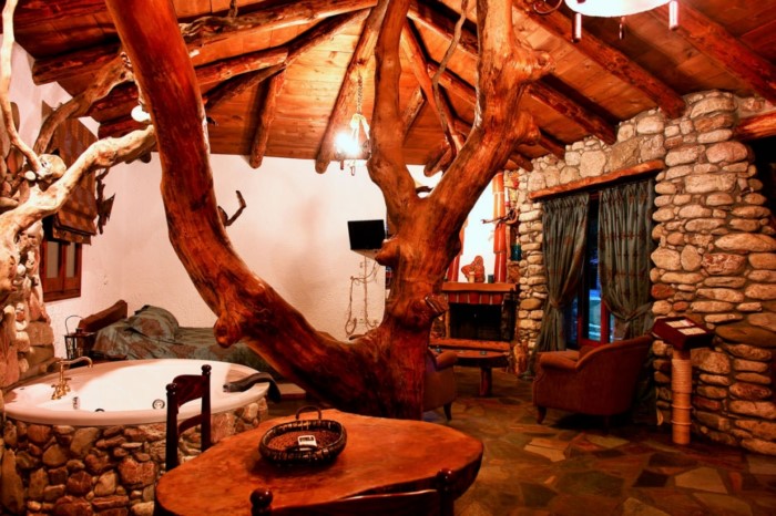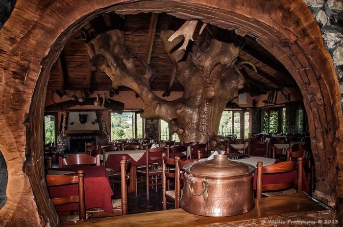 Στον εσωτερικό χώρο δέντρα σου δίνουν την εντύπωση ότι στηρίζουν την σκεπή, ενώ κορμοί δέντρων έχουν μετατραπεί σε τραπέζια, καθίσματα και τζάκια.