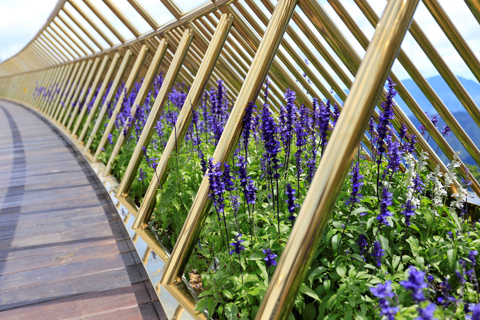 Κατά μήκος του μήκους 150 μέτρων διαδρόμου της γέφυρας είναι φυτεμένα χρυσάνθεμα lobelia, δίνοντας μια μωβ «ραφή» στην κατασκευή.