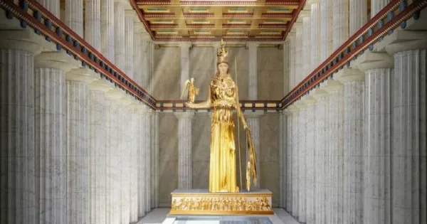 Το παρακάτω πρότζεκτ από το myvouchercodes.co.uk αναδημιούργησε ψηφιακά το εσωτερικό μερικών από τα πιο συναρπαστικά αρχαία ερείπια του κόσμου, φτιάχνοντάς τα όπως πιστεύουν οι ειδικοί ότι έμοιαζαν. Τοποθετημένος επιβλητικά στην κορυφή του λόφου της Ακρόπολης, ο Παρθενώνας χτίστηκε στα μέσα του 5ου αιώνα π.Χ. για να στεγάσει το μνημειώδες χρυσό άγαλμα της Αθηνάς. Όλοι γνωρίζουμε το εξωτερικό του ναού, αλλά τι γινόταν μέσα; Το γιγάντιο άγαλμα της Αθηνάς είχε πάνω από 12 μέτρα ύψος και ήταν φτιαγμένο από σκαλιστό ελεφαντόδοντο και χρυσό, 1.140 κιλά χρυσού, για την ακρίβεια.