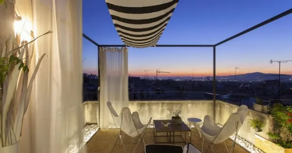 Μια γκαρσονιέρα 15 τ.μ., με αποκλειστική χρήση της ταράτσας, στο δώμα μιας πολυκατοικίας στην περιοχή των Εξαρχείων, που έχει θέα από τον Λυκαβηττό έως τον Πειραιά, αναδιαμορφώθηκε από το studio A-team Architects.