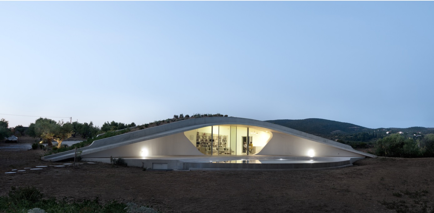 Με μία πρώτη ματιά, κάποιον καταλαβαίνει πως η βίλα είναι λες και έχει χτιστεί κάτω από την γη μιας και η οροφή της είναι ουσιαστικά συνέχεια του χωμάτινου δρόμου που την περικλείει, ξεγελώντας έτσι στο μάτι.