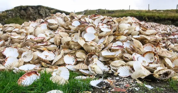 Για κάθε φόρεμα, έφτιαξε μια μεταλλική κατασκευή πριν βάλει πολλές στρώσεις από κελύφη οστράκων ώστε να μοιάζει με μια φουντωτή φούστα.