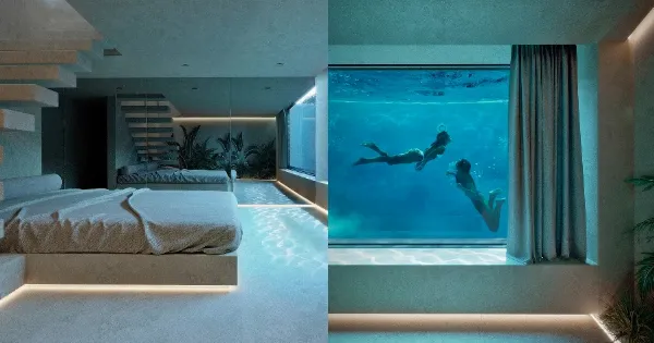 Το φουτουριστικό κτήριο με το πράσινο δημιουργεί ένα απίθανο συνδυασμό στο φυσικό τοπίο. Τα χρώματα, γήινα και ζεστά, είναι ιδανικά. Μια υπέροχη πισίνα δημιουργεί το τέλειο backround στο υπόγειο υπνοδωμάτιο με ειδυλλιακή, μυστηριακή ατμόσφαιρα.