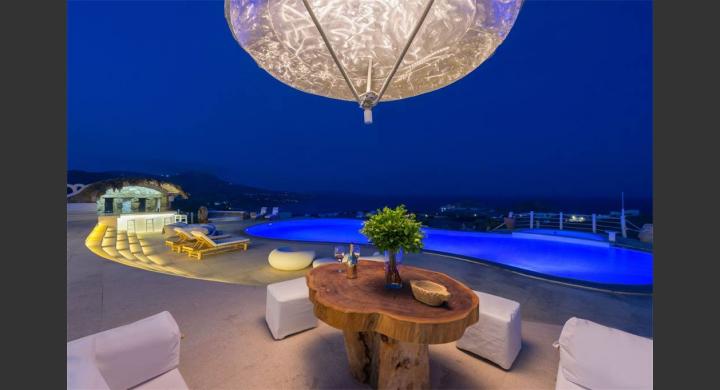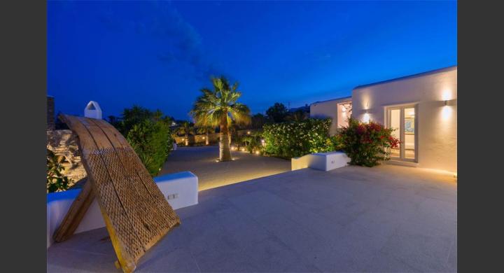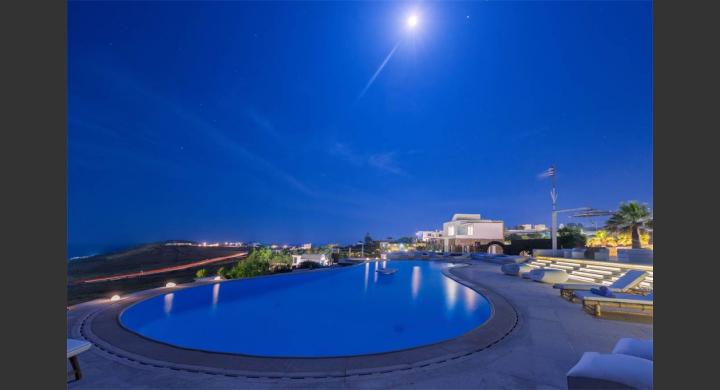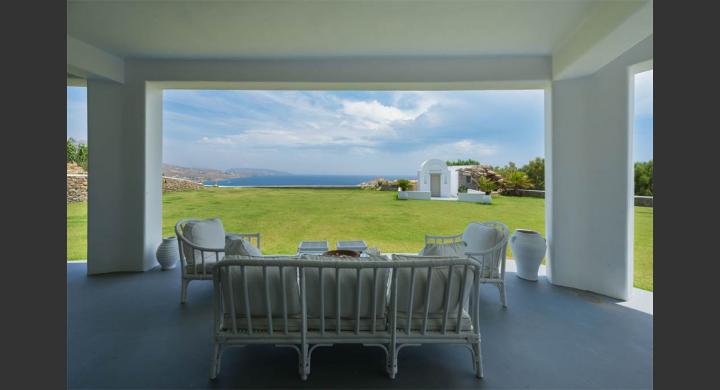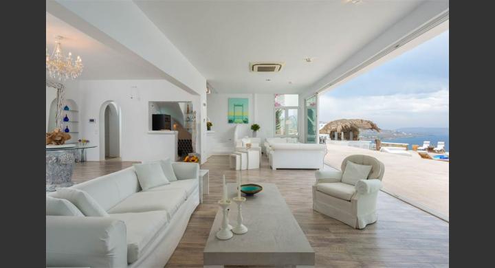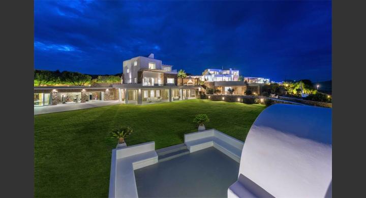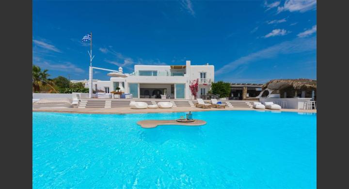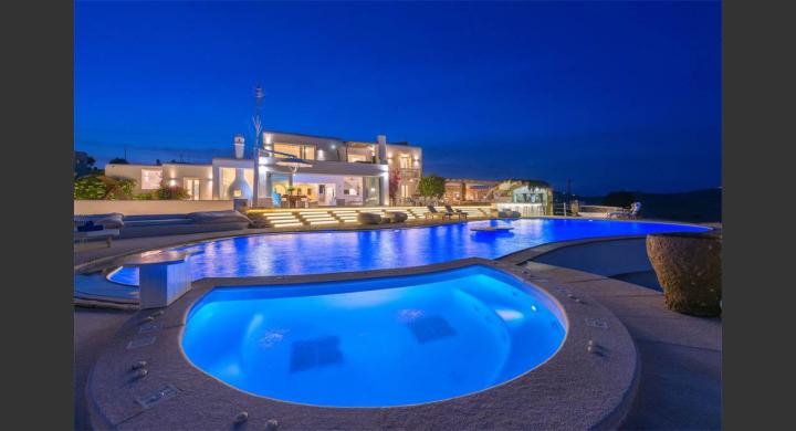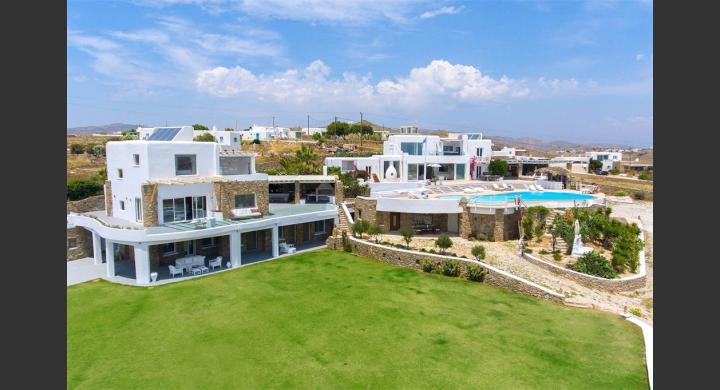 Η ιδιοκτησία βρίσκεται σε ένα οικόπεδο 7.000 τ.μ. και αποτελείται από τρία κτήρια συνολικής επιφάνειας 1.500 τ.μ. Βρίσκεται λίγα λεπτά μακριά από τις πιο κοσμοπολίτικες παραλίες της Μυκόνου και διαθέτει 13 υπνοδωμάτια, το καθένα με τη δική του είσοδο και το δικό του μπάνιο, μια τεράστια πισίνα υπερχείλισης και σαλόνια με θέα το Αιγαίο.