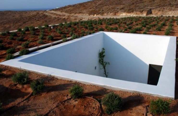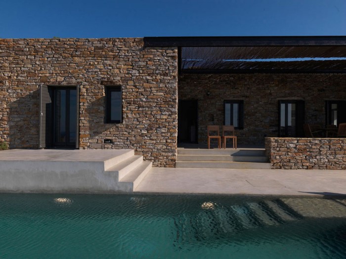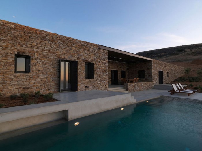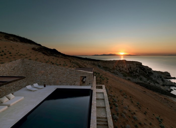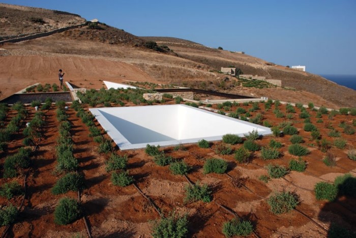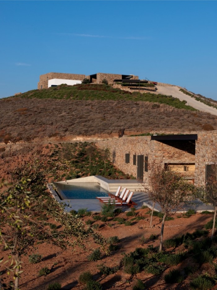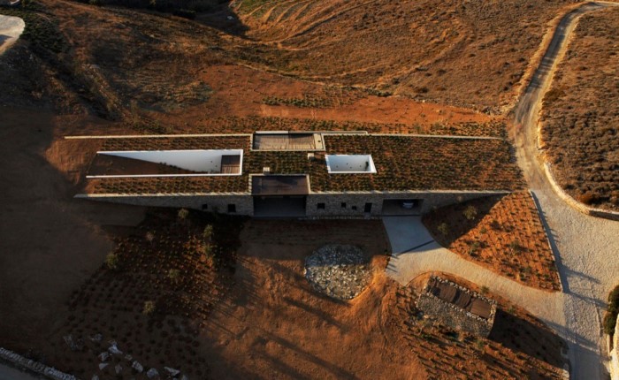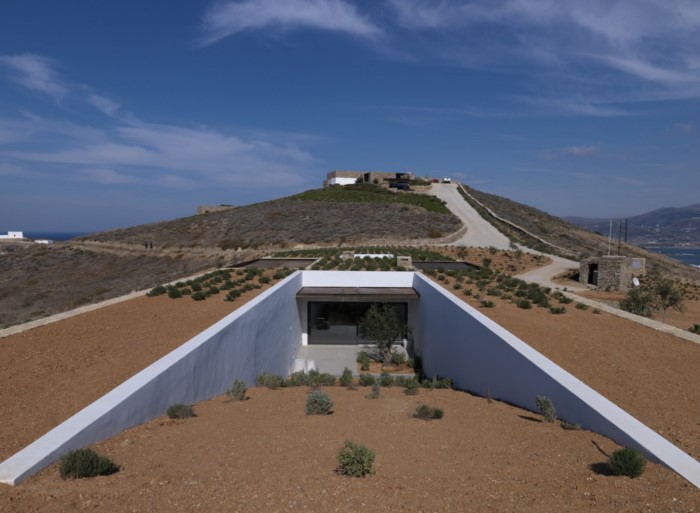 Αυτή η απλή στρατηγική σβήνει τα όρια της κατοικίας και εξαφανίζει τον όγκο της από την ευρύτερη κορυφογραμμή του νησιού.