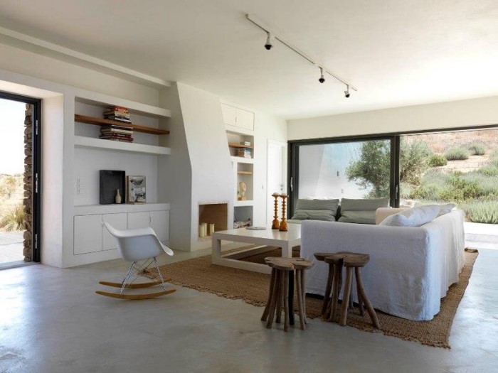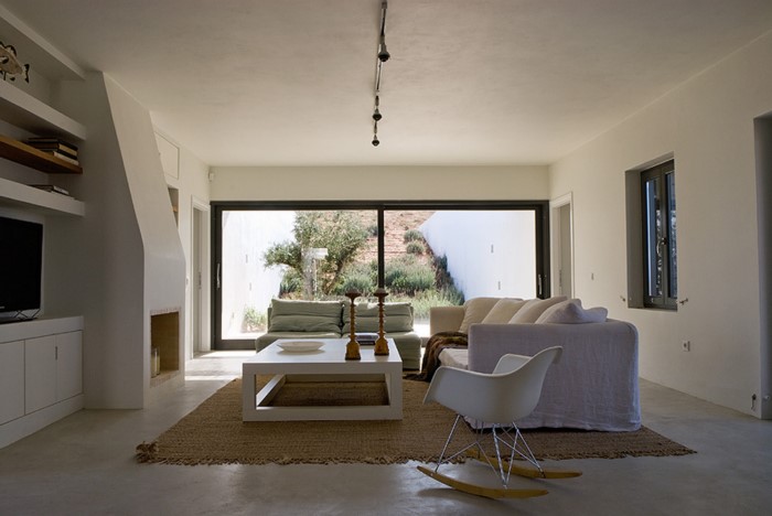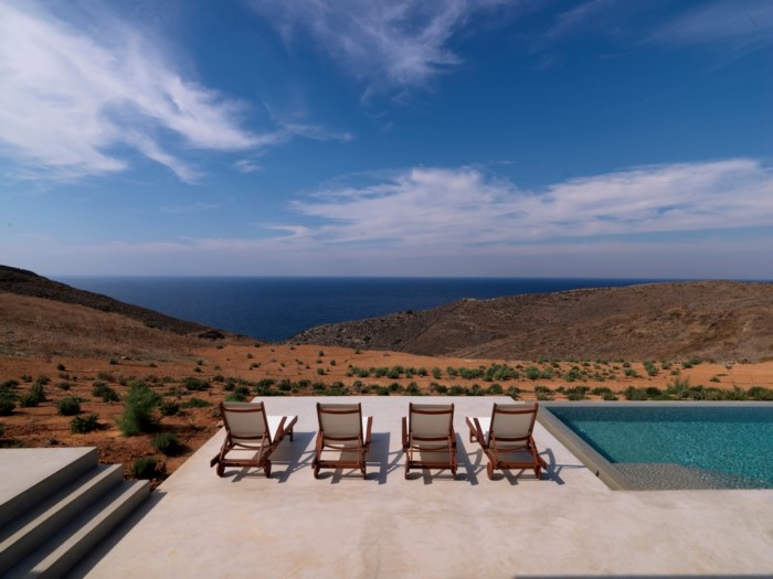 Τα 240 τετραγωνικά του, που αποτελούνται από υπνοδωμάτια, καθιστικό, τραπεζαρία, κουζίνα, μπάνιο και γκαράζ, επικοινωνούν από την μία πλευρά με μια πισίνα και από την άλλη με μια μεγάλη αυλή που προσφέρει εντυπωσιακή θέα προς το Αιγαίο.
