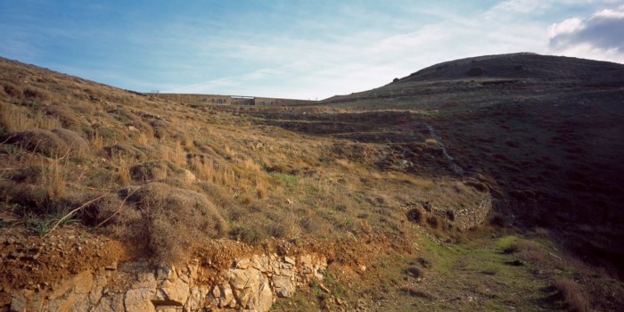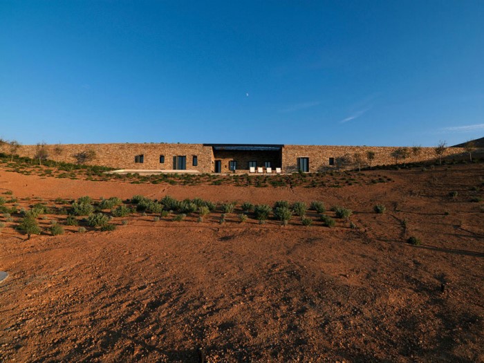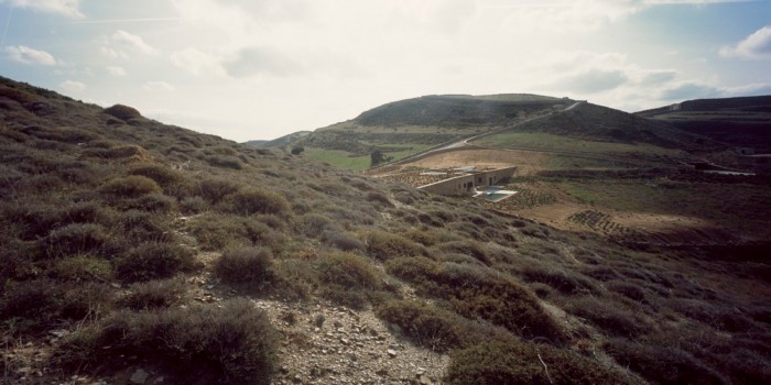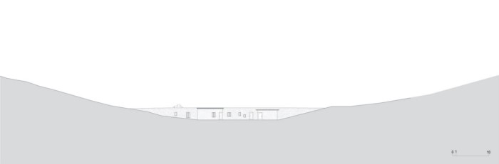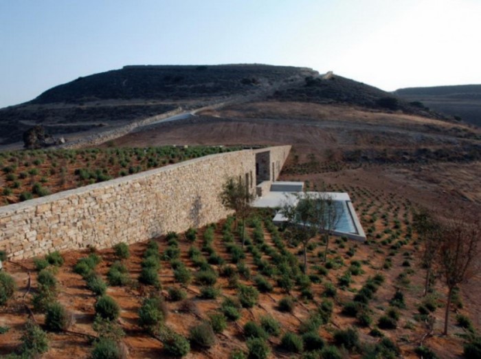 Δύο επιμήκεις πέτρινοι τοίχοι γεφυρώνουν τους λόφους, επιτρέπουν στην κατοικία να «φωλιάσει» στην εσοχή αυτή και διατηρούν ταυτόχρονα τη συνέχεια του τοπίου που απλώνεται ανενόχλητο από πάνω της.