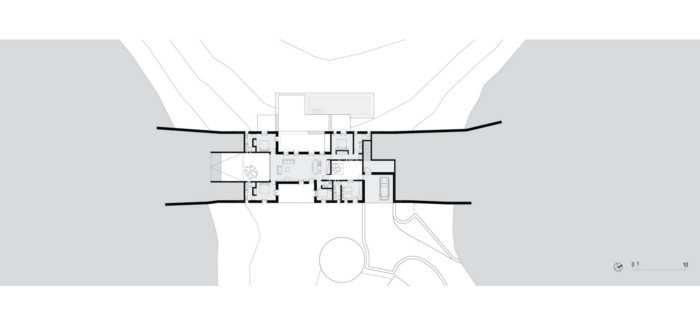Έτσι όλοι οι υπόσκαφοι χώροι του σπιτιού φωτίζονται και αερίζονται διαμπερώς, οι εξωτερικοί χώροι προστατεύονται από τα καιρικά φαινόμενα ενώ παράλληλα το σπίτι απολαμβάνει τη θέα και δημιουργεί μία συμπαγή αλλά και πλούσια σχέση με το έδαφος.