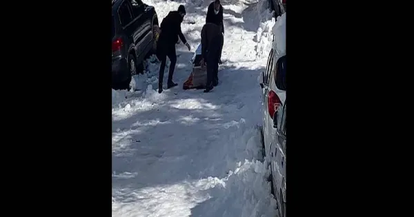 Οι 3 άνδρες φαίνονται στο video να σέρνουν στο χιόνι το φέρετρο, σε ένα στενό με πάνω από 30 πόντους χιόνι, ενώ ένας εξ αυτών γλυστράει στην προσπάθειά του. Το δε φέρετρο είναι πάνω σε μια κουβέρτα για να γλυστράει…