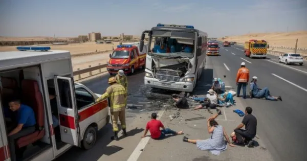 Σύμφωνα με τις αρχές, περίπου 36 άτομα τραυματίστηκαν σοβαρά στην πρόσκρουση που σημειώθηκε στον δρόμο Ras Gharib-Hurghada, βόρεια της Ερυθράς Θάλασσας κοντά στη Χουργκάντα.