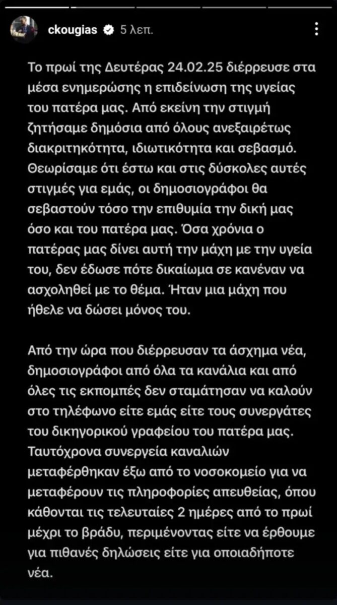 «Το πρωί της Δευτέρας 24.02.25 διέρρευσε στα μέσα ενημέρωσης η επιδείνωση της υγείας του πατέρα μας. Από εκείνη την στιγμή ζητήσαμε δημόσια από όλους ανεξαιρέτως διακριτικότητα, ιδιωτικότητα και σεβασμό. Θεωρήσαμε ότι έστω και στις δύσκολες αυτές στιγμές για εμάς, οι δημοσιογράφοι θα σεβαστούν τόσο την επιθυμία την δική μας όσο και του πατέρα μας. Όσα χρόνια ο πατέρας μας δίνει αυτή τη μάχη με την υγεία του, δεν έδωσε ποτέ δικαίωμα σε κανέναν να ασχοληθεί με το θέμα. Ήταν μια μάχη που ήθελε να δώσει μόνος του.