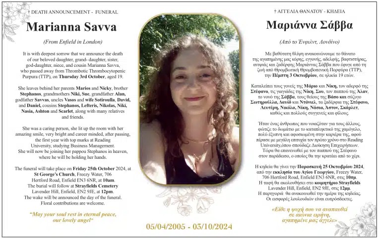 Με βαθύτατη θλίψη ανακοινώνουμε το θάνατο της αγαπημένης μας κόρης, εγγονής, αδελφής, βαφτιστήρας, ανιψιάς και ξαδέρφης Μαριάννας Σάββα που έφυγε από τη ζωή από Θρομβωτική Θρομβοπενική Πορφύρα (TTP), την Πέμπτη 3 Οκτωβρίου, σε ηλικία 19 ετών.