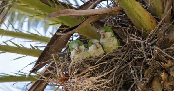 Κοιτώντας στις κορυφές των πεύκων του πάρκου θα βρείτε δεκάδες πολύ μεγάλες φωλιές οι οποίες κυριολεκτικά είναι σαν να κρέμονται στον αέρα. Πρόκειται για το είδος που λέγεται Myiopsitta monachus ή απλούστερα Γκριζοπρόσωπος Παπαγάλος, ο οποίος έχει την πολύ σπάνια για παπαγάλους συνήθεια να φτιάχνει κλαδόπλεκτες φωλιές.