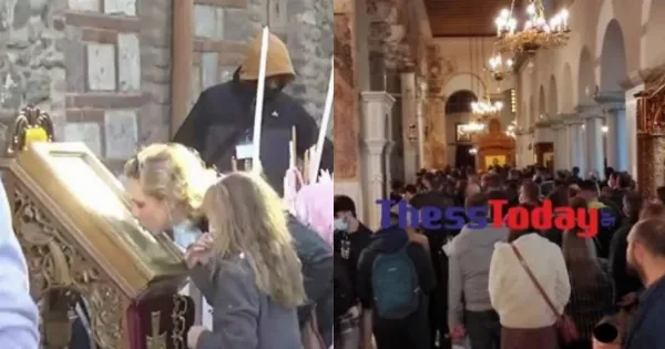 Παρόλα αυτά, όπως σημειώνει το thesstoday.gr, ούτε στις εισόδους ούτε εντός του Ιερού Ναού βρίσκονται δυνάμεις της Ελληνικής Αστυνομίας, με συνέπεια την ανεξέλεγκτη συρροή πιστών, η πλειοψηφία των οποίων δεν φορά μάσκα και ασπάζεται τις εικόνες.