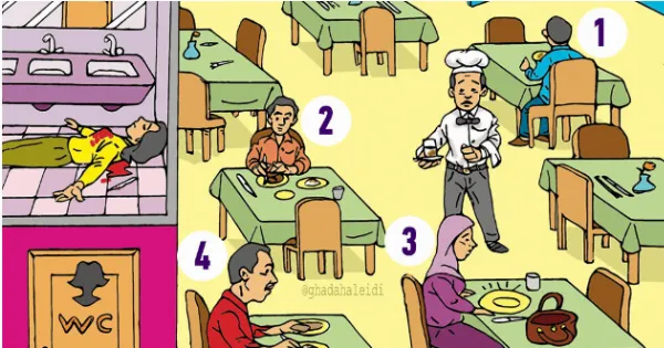 Όπως θα παρατηρήσετε και στο σκίτσο υπάρχει μια νεκρή γυναίκα στην τουαλέτα. Οι ύποπτοι είναι αριθμημένοι από το ένα έως το τέσσερα.