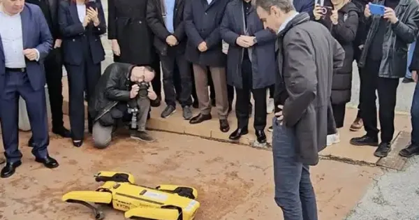 Τον πρωθυπουργό υποδέχτηκε ο… Κύων, το σκυλί – ρομπότ που δημιούργησε το ΙΜΕΤ, το οποίο βοηθά στον απεγκλωβισμό ανθρώπων σε περιστατικά φυσικών καταστροφών.