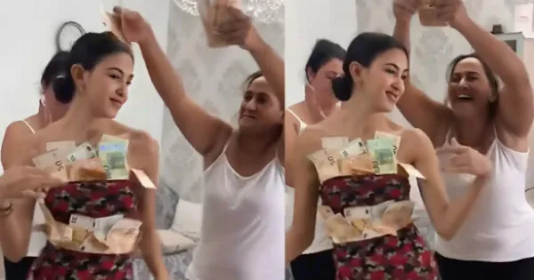 Το συγκεκριμένο βίντεο δείχνει μια πεθερά να λούζει στην κυριολεξία την νύφη της με χαρτονομίσματα χιλιάδων ευρώ να πέφτουν στο πάτωμα. Η χαρά της πεθεράς δεν περιγράφεται με ένα μεγάλο χαμόγελο.