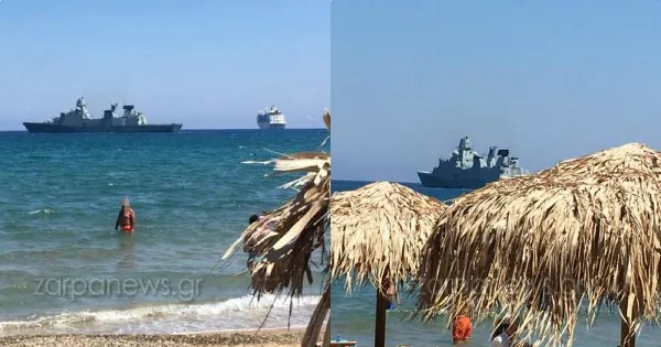 Η φρεγάτα και το κρουαζιερόπλοιο ήταν αρόδο και στην ακτή οι λουόμενοι, συνθέτοντας ένα όχι και τόσο συνηθισμένο – και καθόλου ευχάριστο – σκηνικό.