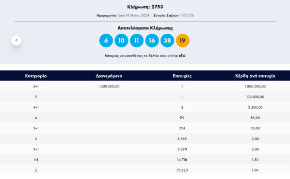 Στην κλήρωση του τζόκερ, Τρίτη, 14 Μαΐου 2024, αναδείχθηκε ένας τυχερός που κέρδισε ένα εκατομμύριο ευρώ στην 1η κατηγορία.