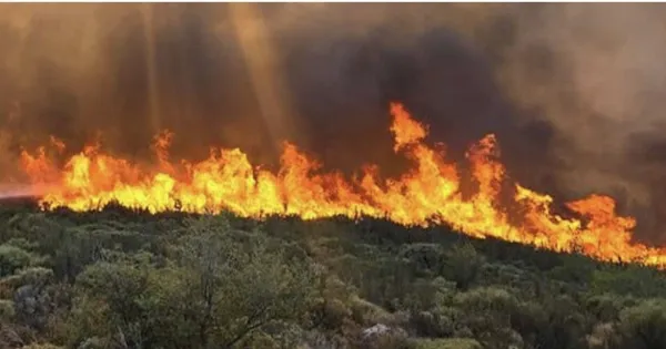 Οι καιρικές συνθήκες στην περιοχή είναι ιδιαίτερα δυσμενείς καθώς πνέουν ισχυροί άνεμοι, γεγονός που ευνοεί την επέκταση της πυρκαγιάς.