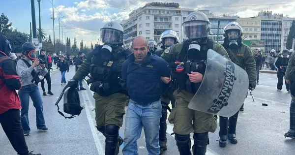 Βίντεο ντοκουμέντο κατέγραψε το Newsbomb.gr: Διαδηλωτής, μετά το τέλος του συλλαλητηρίου για τα Τέμπη, στέκεται επί της Αμαλίας προκαλώντας τους αστυνομικούς των ΜΑΤ που απωθούσαν κουκουλοφόρους, να τον συλλάβουν.