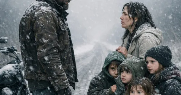 Στην αρχή, μόνο σκιές. Έπειτα, μια γυναίκα και τέσσερα παιδιά που πάλευαν με τον άνεμο, σαν να πολεμούσαν την ίδια την καταιγίδα. Ο Marcus φρέναρε απότομα, η μηχανή γλίστρησε στον πάγο και σταμάτησε.