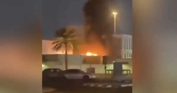 Πυκνός καπνός κάλυψε τον ουρανό στην περιοχή που βρίσκεται το αμερικανικό προξενείο στο Ντουμπάι, με τις φλόγες να υψώνονται, δημιουργώντας σκηνικό καταστροφής.