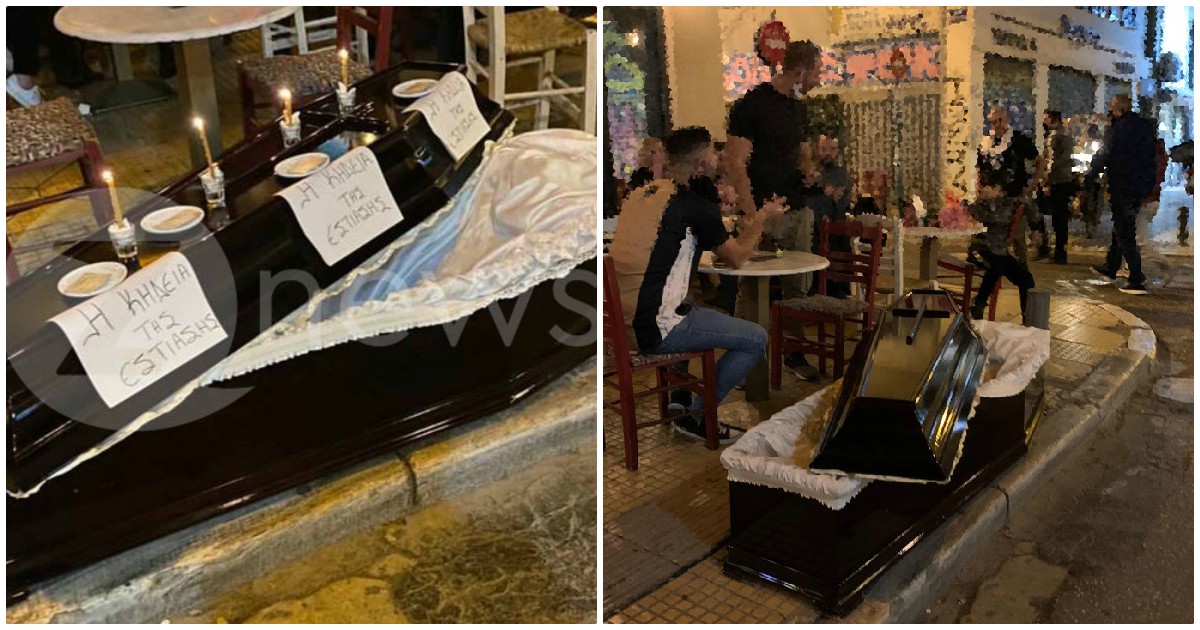 Σε μία συμβολική διαμαρτυρία προέβησαν χθες υπεύθυνοι σε κατάστημα υγειονομικού ενδιαφέροντος στου Ψυρρή. Προφανώς οι εργαζόμενοι στο χώρο της εστίασης είναι πολύ δυσαρεστημένοι με τα νέα μέτρα, οπότε αποφάσισαν να το δείξουν. Έβγαλαν λοιπόν ένα φέρετρο έξω από το γνωστό μεζεδοπωλείο Αρόδου, για να δείξουν ότι το μέλλον του κλάδου θα είναι ”σκοτεινό”.