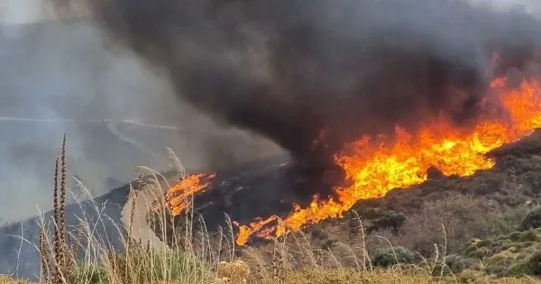 Σύμφωνα με τον αντιπεριφερειάρχη Γιώργο Κελαϊδίτη, «η φωτιά είναι ανεξέλεγκτη. Οι ισχυροί άνεμοι φτάνουν και τα 9 μποφόρ με συνέπεια να μην μπορούν να προσεγγίσουν την περιοχή τα εναέρια μέσα».