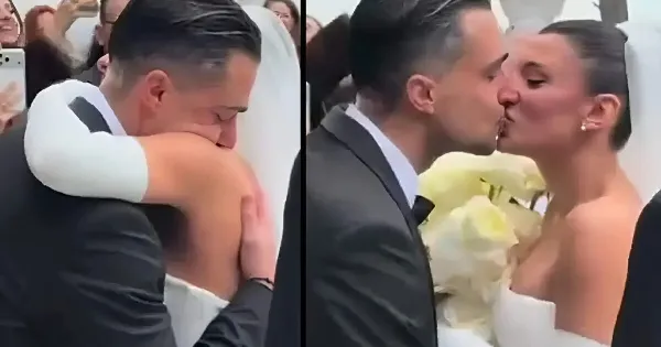 Σε βίντεο που ήρθε στο φως της δημοσιότητας από τα social media, φαίνεται η στιγμή που η νύφη φτάνει στην εκκλησία και ο γαμπρός την αντικρύζει για πρώτη φορά. Ο επιχειρηματίας δεν μπόρεσε να συγκρατήσει την συγκίνησή του βλέποντας την γυναίκα της ζωής του ντυμένη νύφη, με τον ίδιο να της δίνει ένα παθιασμένο φιλί και να την αγκαλιάζει σφιχτά.