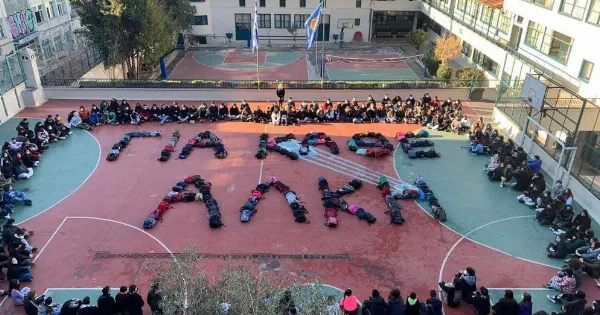 Η φράση “για κάθε Άλκη” σχηματισμένη από σχολικές τσάντες