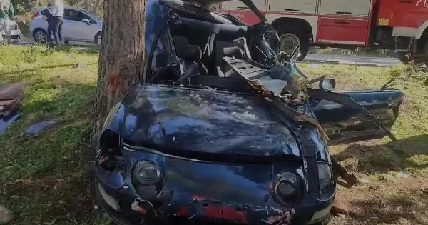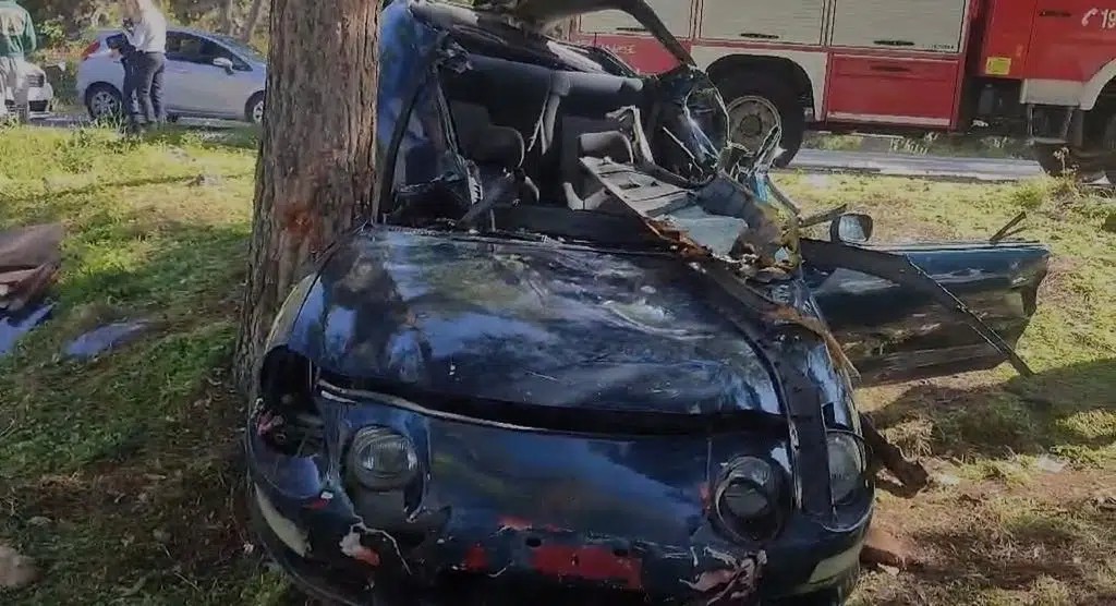Από τη σφοδρότητα του χτυπήματος του αυτοκινήτου επάνω στο δέντρο εγκλωβίστηκαν τα δύο άτομα καθώς το αμάξι μετατράπηκε σε άμορφη μάζα.