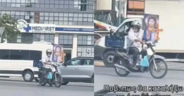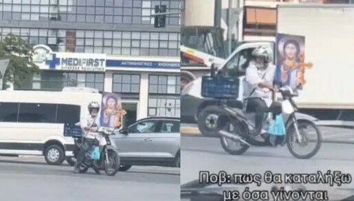 Ένας οδηγός δικύκλου οδηγάει το μηχανάκι του, στο κέντρο της Αθήνας, κρατώντας ταυτόχρονα μια μεγάλη εικόνα του Ιησού Χριστού και έναν τεράστιο σταυρό.